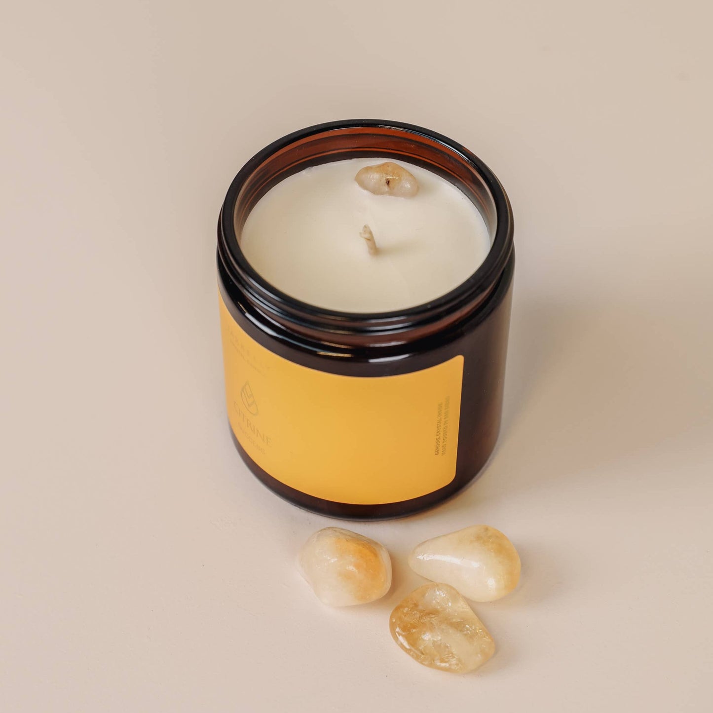 Indulge your senses with this soy wax candle by JaxKelly featuring notes of bergamot, ginger, and jasmine. This beauty is adorned with a genuine Citrine crystal nestled at the top, adding a little more meaning to your candle experience.