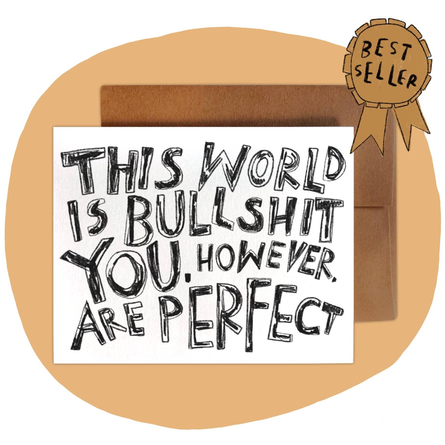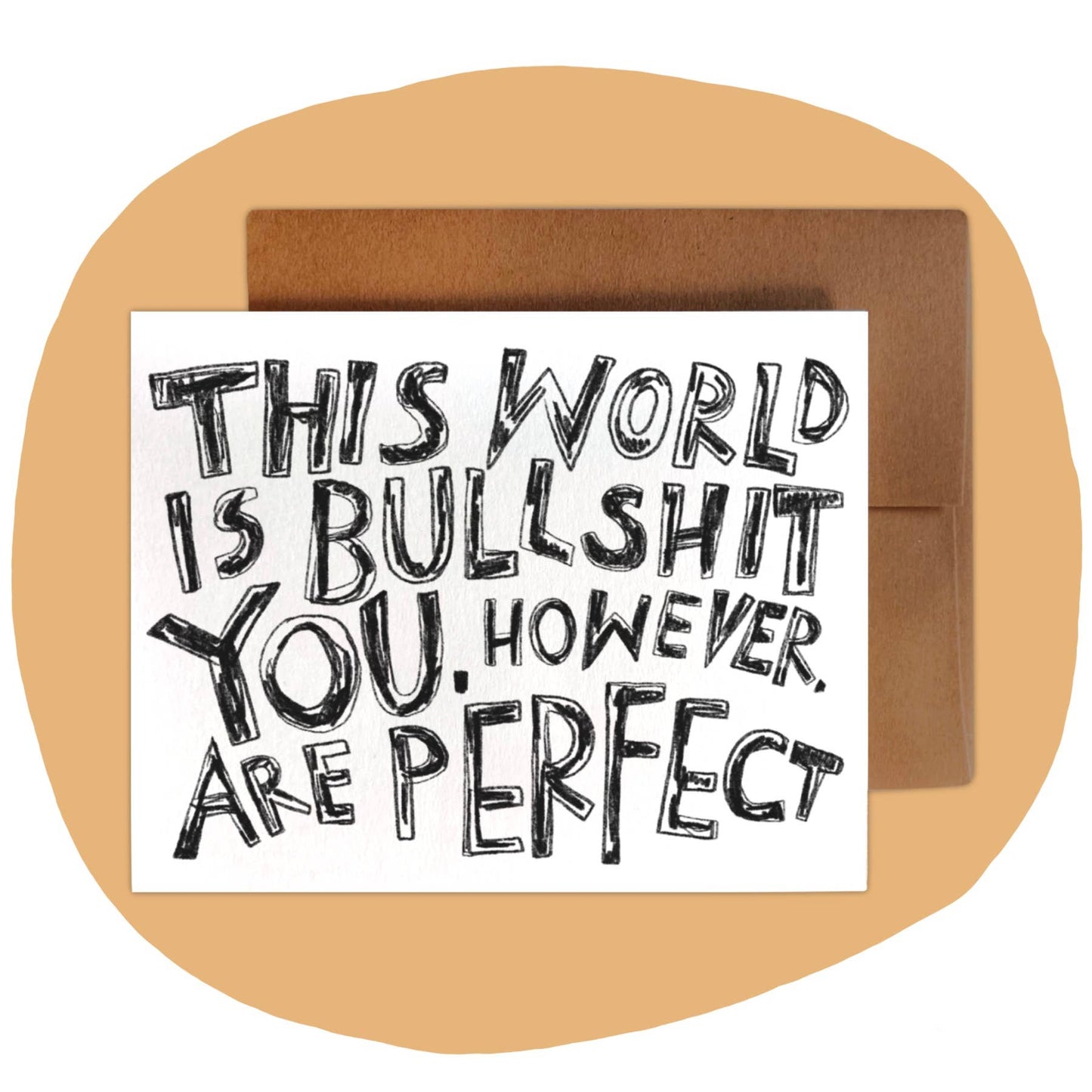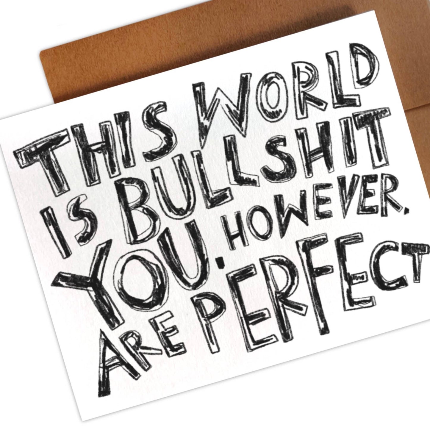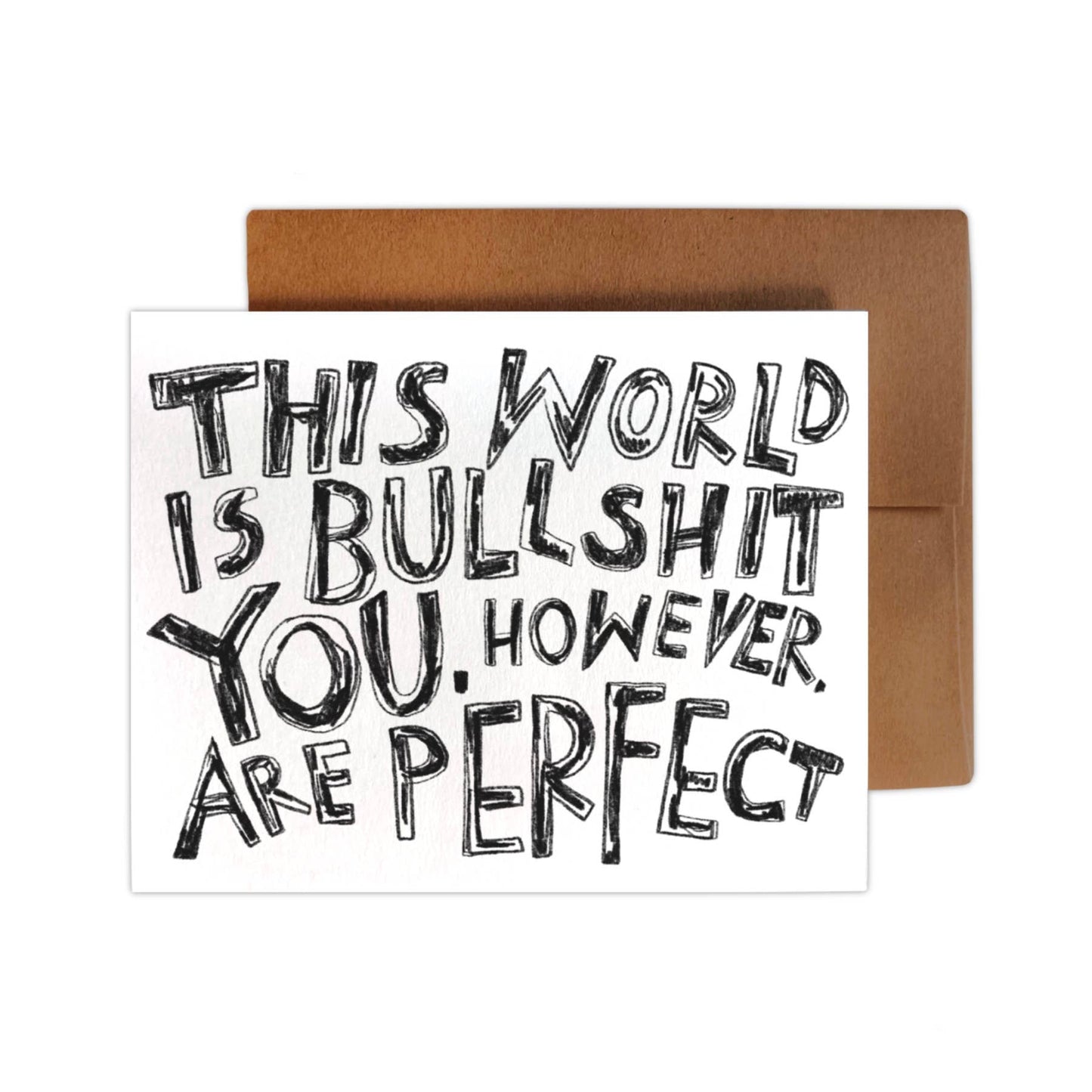 Scribbly & blocky letters read: the world is bullshit. You, however, are perfect. A perfect card to send to anyone who's feeling low. A good reminder that it's okay if we don't perfectly fit into the systems we have to operate within.